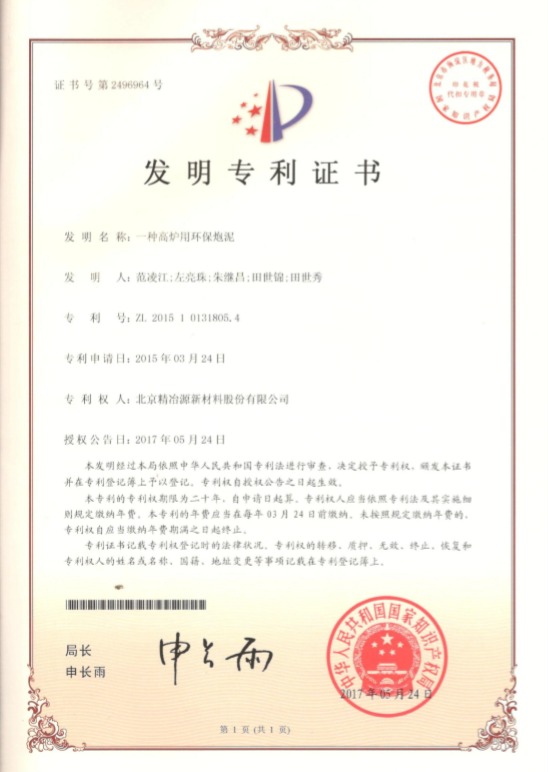 近日,由北京精冶源新材料河北有限公司(簡稱:精冶源;股票代碼:831091)研發的一種新型結合劑環保炮泥喜獲國家知識產權局發明專利授權,專利號:201810621824.9。這是精冶源在爐前炮泥領域獲得的第四項國家專利。