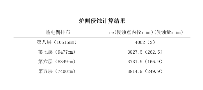 中陽鋼鐵1#高爐投產(chǎn)一年后,利用一維穩(wěn)態(tài)導熱模型對爐底爐缸侵蝕量進行測算,結(jié)果表明:爐缸側(cè)壁侵蝕量最大為263mm,象腳區(qū)為250mm,爐底侵蝕量最大為70mm。
